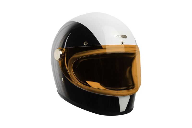 … with a motorcycle: Keep him safe and looking cool while zipping around the neighborhood in the handmade Heroine Racer Tux ($978) from Hedon Helmets. Inspired by vintage British designs, the black and white retro design offers full face coverage and an antifog double lens.